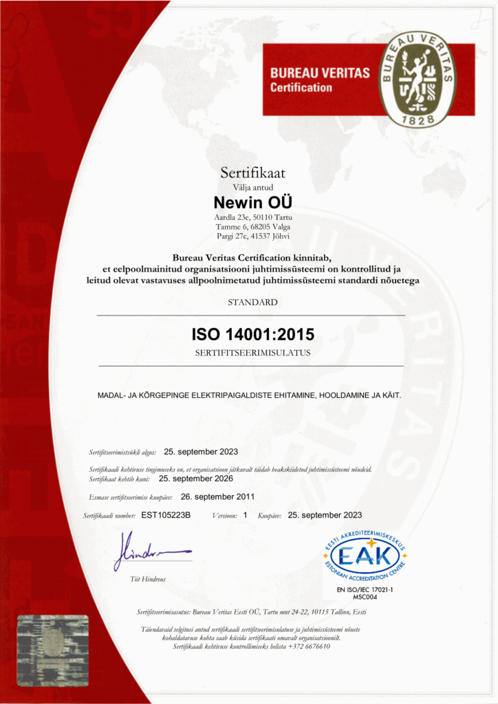 Järgime ettevõtte juhtimises, planeerimises ja igapäevases tegevuses standardeid ISO 9001:2015 ja ISO 14001:2015.